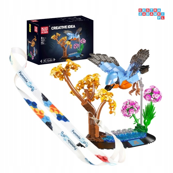 Zestaw Mould King 10151 to piękny, 609-elementowy projekt, który pozwala zbudować realistyczny model niebieskiego rudzika w locie. Ptak, uniesiony na przezroczystej podpórce, zachwyca misternie odwzorowanym upierzeniem i rozpostartymi skrzydłami. Kompozycja umieszczona na dekoracyjnej podstawce z wodą i roślinnością stanowi idealny element dekoracyjny dla każdego miłośnika natury i kreatywnego modelarstwa.