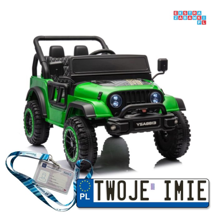 Bezpieczeństwo użytkownika o wadze do 30 kg jest zapewnione przez zintegrowane pasy, otwierane drzwi z blokadą oraz automatyczny hamulec, który reaguje natychmiast po zdjęciu nogi z pedału gazu przez młodego rajdowca. Przednie reflektory LED nadają pojazdowi nowoczesnego charakteru, a dołączony pilot zdalnego sterowania 2.4GHz pozwala opiekunom na pełną kontrolę nad torem jazdy oraz wybór jednej z trzech dostępnych prędkości. Zestaw wzbogacono o unikalne dodatki personalizowane, takie jak tablice rejestracyjne z imieniem oraz profesjonalne prawo jazdy z dwustronną smyczą, co sprawia, że każda wyprawa staje się dla dziecka realistyczną nauką odpowiedzialności za kierownicą własnego, potężnego pojazdu.