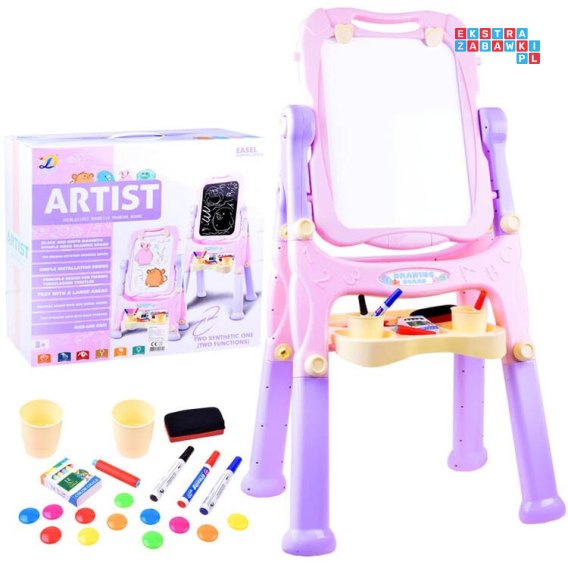 Duża, kolorowa tablica magnetyczno-kredowa sprawdzi się w każdym pokoju dziecięcym. W całości wykonana z plastiku w pastelowej kolorystyce, jest lekka, stabilna i bezpieczna dla dziecka. Tablica posiada obrotową płaszczyznę do rysowania i pisania. Jedna strona jest czarna, przeznaczona do pisania kredą, natomiast druga strona jest magnetyczna i pozwala na pisanie markerem suchościeralnym, przyczepianie magnesów oraz mocowanie kartek do malowania i rysowania. Półeczka oraz kubeczki na przybory ułatwiają przechowywanie akcesoriów i pomagają utrzymać porządek podczas zabawy.