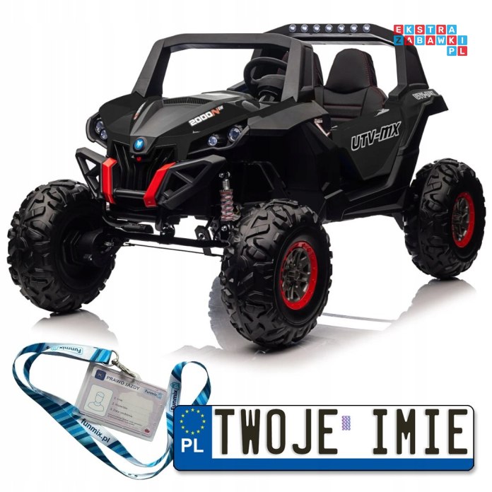 Potężne Buggy UTV-MX 2000N na akumulator z napędem 4x4 i regulowanym zawieszeniem. Wyposażone w cztery silniki 75W, miękkie koła EVA, wentylowany fotel z ekoskóry oraz oświetlenie LED na pałąku, zapewnia bezpieczną i ekstremalną zabawę w terenie przy obciążeniu do 50 kg.