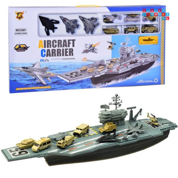 Lotniskowiec wojskowy z samolotami i pojazdami, duży zestaw militarny