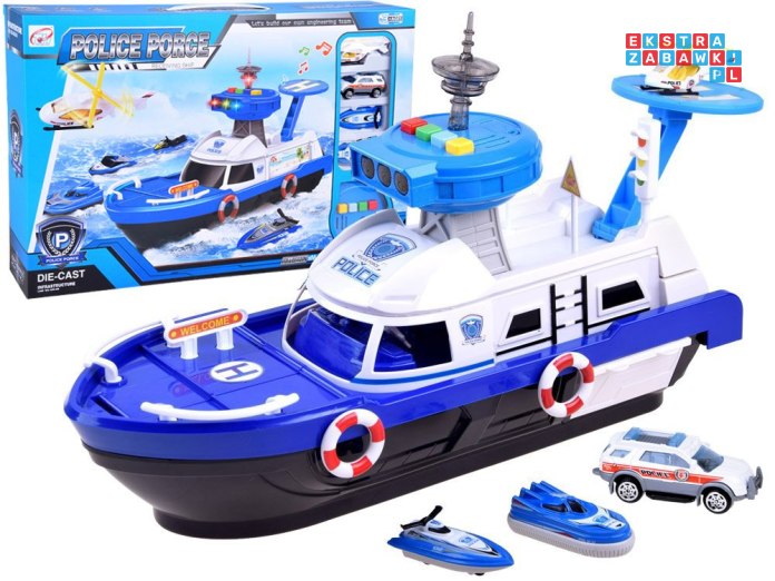 Zestaw policja na wodzie, łódź policyjna z pojazdami, światło i dźwięk