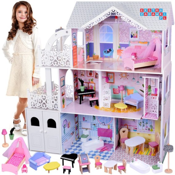 Duży Ażurowy Domek drewniany dla lalek + Winda Garaż Balkon Meble ZA5388
