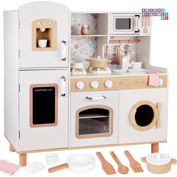Kuchnia oferuje imponujący zestaw funkcji i akcesoriów, w tym pralka, piekarnik, lodówka, mikrofalówka, palniki z efektami dźwiękowymi i świetlnymi, zlew z kranem o zamkniętym obiegu wody. Otwierane szafki, półki na akcesoria. Dzieci znajdą tu także drewniany garnek z pokrywką, patelnię, kubek, solniczkę, pieprzniczkę. Tablica na drzwiach lodówki pozwala na zapisywanie listy zakupów lub wiadomości, co dodatkowo rozwija kreatywność.