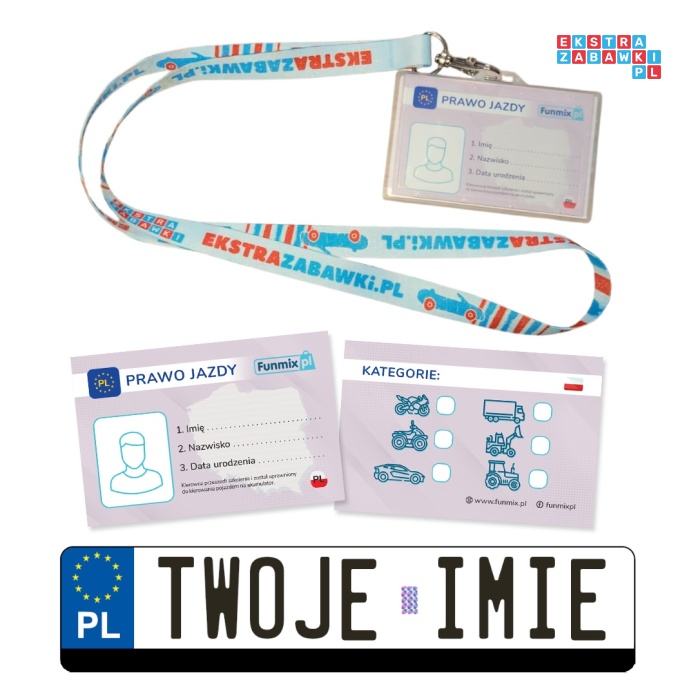 Prawo jazdy jest wielkości oryginalnego ok 85,6 mm x 54 mm z miejscem na wklejenie zdjęcia i podanie danych dziecka wraz z posiadanymi uprawnieniami. Aby nie była to chwilowa zabawka, która zaraz się zniszczy lub zginie w zestawie dodajemy identyfikator do którego montujemy prawo jazdy, a następnie identyfikator przypinamy do smyczki, którą również jest w zestawie. Taki komplet dziecko może nosić na szyi. Smycz jest wysokiej jakości z dwustronnym nadrukiem - nie jak w przypadku tańszych gdzie druga strona jest w całości biała co wygląda nieestetycznie i ulega szybkiemu zabrudzeniu.
