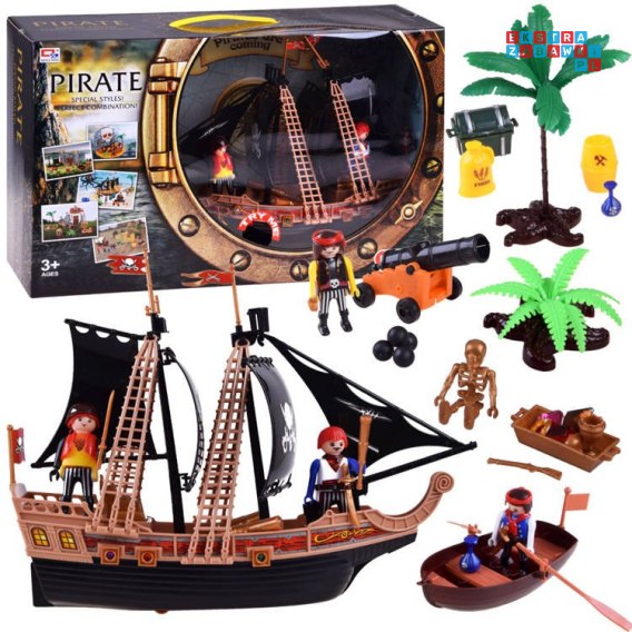 Wieloelementowy zestaw z pewnością przypadnie do gustu każdemu fanowi pirackich opowieści. Znajdziemy tu wszystko, co potrzebne do wymyślania i odgrywania niesamowitych przygód. Dzielni żołnierze mogą ścigać piracką bandę, lub nieustraszeni korsarze wyruszą na poszukiwanie zaginionego skarbu- pomysłów na zabawę jest wiele.